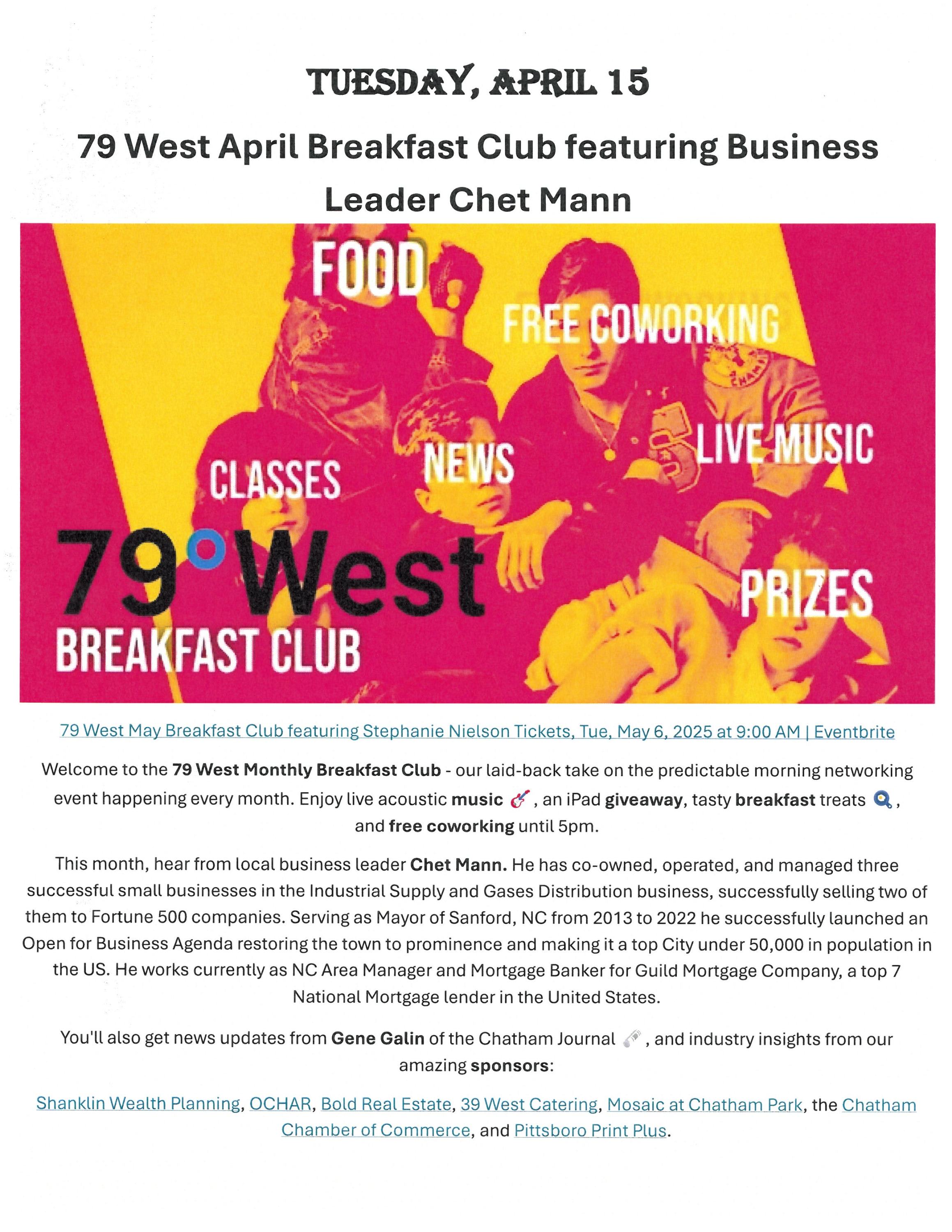 Welcome to the 79 West Monthly Breakfast Club - our laid-back take on the predictable morning networking event happening every month. Enjoy live acoustic music, an iPad giveaway, tasty breakfast treats, and free coworking until 5pm. This month, hear from local business leader Chet Mann. He has co-owned, operated, and managed three successful small businesses in the Industrial Supply and Gases Distribution business, successfully selling two of them to Fortune 500 companies. Serving as Mayor of Sanford, NC from 2013 to 2022 he successfully launched an Open for Business Agenda restoring the town to prominence and making it a top City under 50,000 in population in the US. He works currently as NC Area Manager and Mortgage Banker for Guild Mortgage Company, a top 7 National Mortgage lender in the United States. You'll also get news updates from Gene Galin of the Chatham Journal , and industry insights from our amazing sponsors: Shanklin Wealth Planning, OCHAR, Bold Real Estate, 39 West Catering, Mosaic at Chatham Park, the Chatham Chamber of Commerce, and Pittsboro Print Plus.