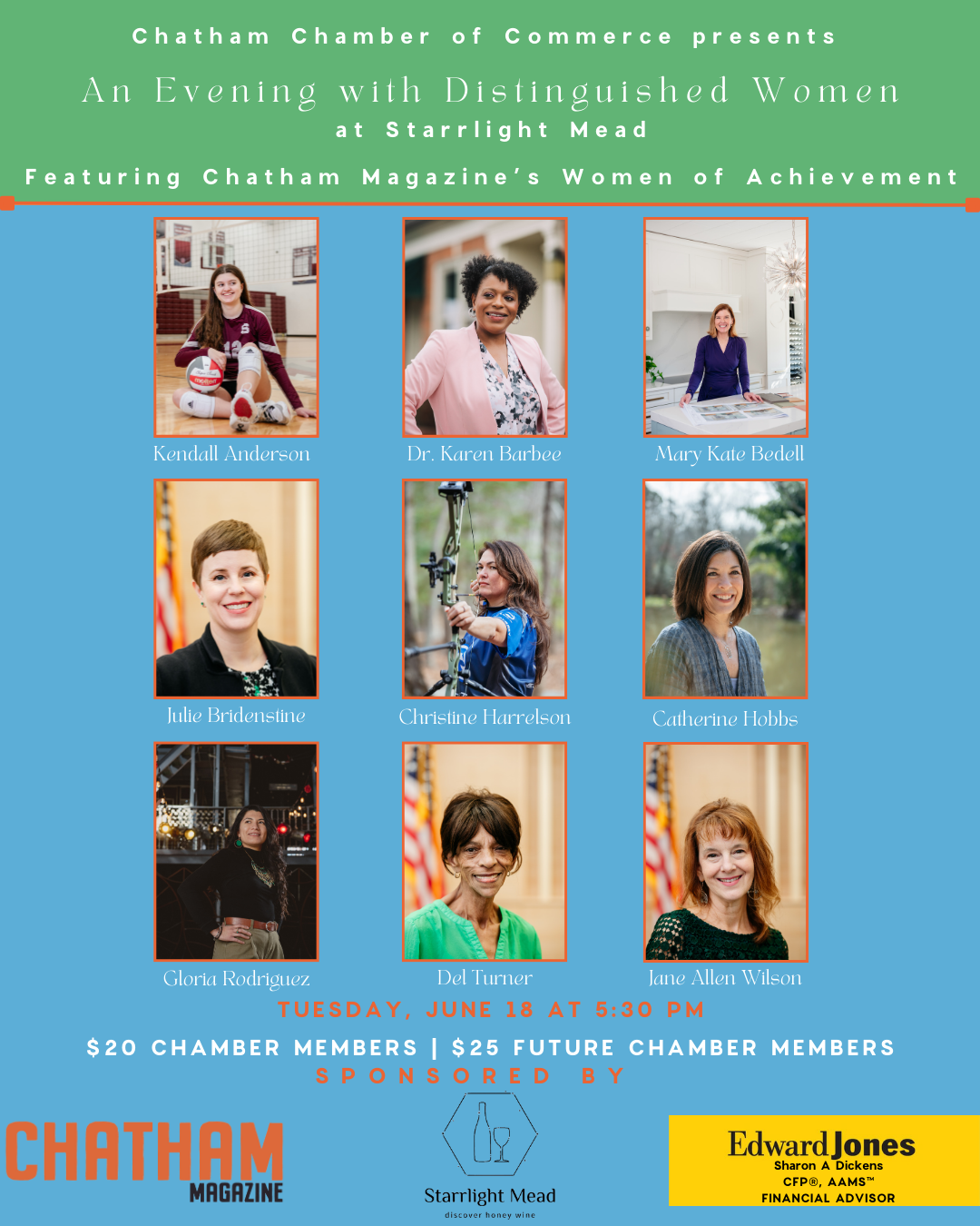 We’d like to thank Chatham Magazine, Edward Jones - Sharon Dickens, and Starrlight Mead for sponsoring this special occasion. Tickets are $20 for Chamber Members and $25 for Future Chamber Members.