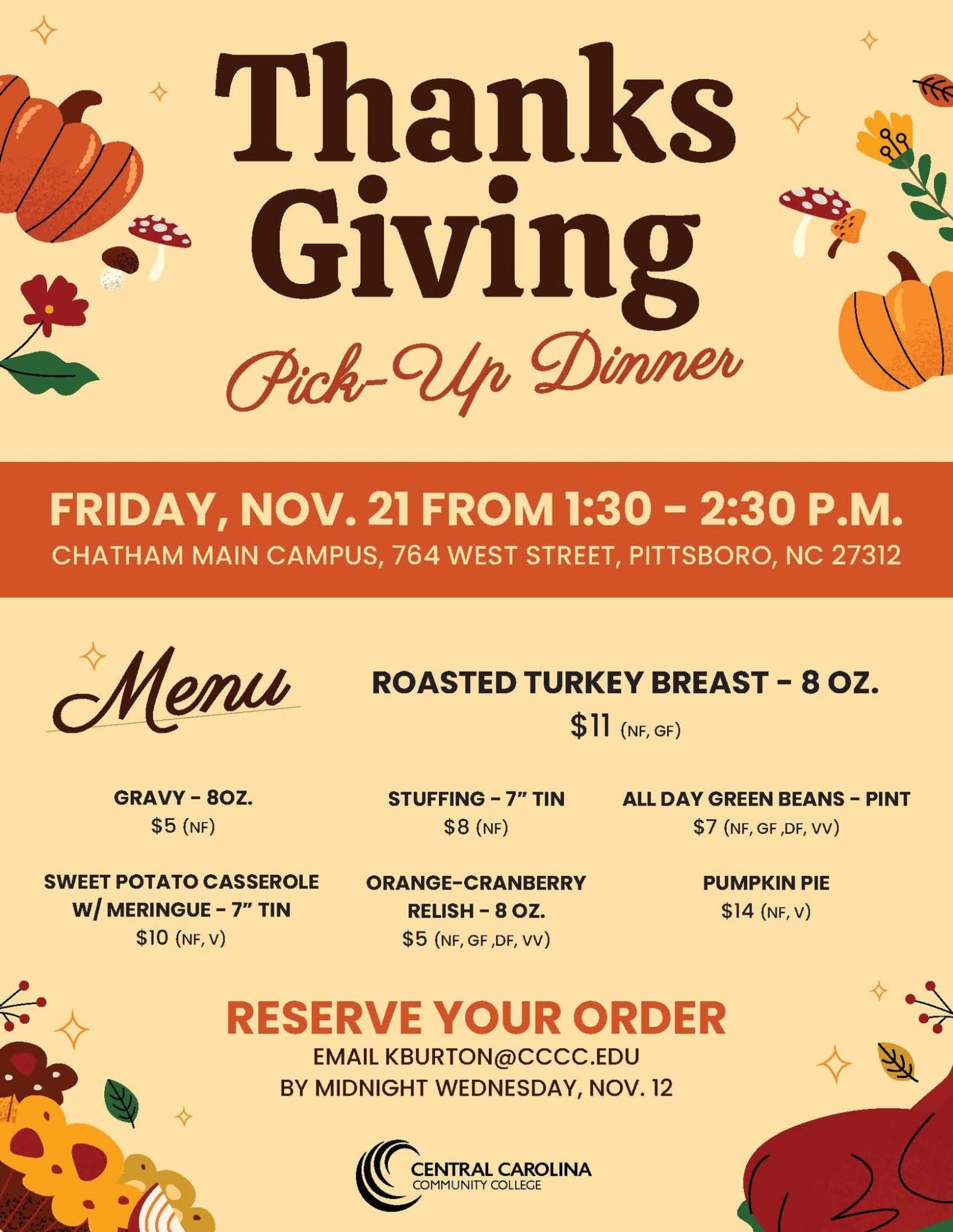 The Chatham CCCC Culinary Arts department has an early Thanksgiving meal available for you to pick up on Friday, November 21st! Please make sure to reserve yours by emailing Chef Kelly (kburton@cccc.edu) - the order deadline is Wednesday, November 12th, and don't forget to tell her what you'd like! All items are sold a la carte, and the pie is a whole pie.